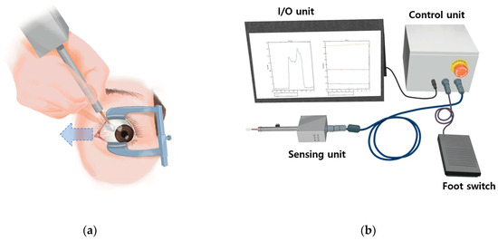 The proposed active extraocular muscle (EOM) tension measuring device (ATMD). (a) Initial position for the force generation test using the ATMD. (b) The ATMD comprised sensing, control, input–output (I/O) units, a display, and a foot switch.