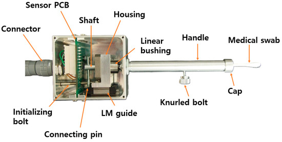 Details of the sensing unit, which comprised a medical swab, linear bushing, linear motion (LM) guide, pin, initializing bolt, and sensory printed circuit board (PCB).