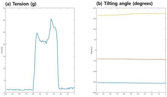 The I/O unit comprised foot and emergency switches for input and a laptop for real-time displaying and data storing of measured signals. Start and termination commands were provided by the foot switch. The entire power of the ATMD could immediately be cut off by pressing the emergency switch in order to avoid electrical injuries. The graphs could display force and three-axes tilting angles as real-time waveforms on the laptop display, as shown in Figure 4. All of the data could also be stored using the commercially available computing software MATLAB R2019b (MathWorks, Natick, MA, USA). A video detailing the device’s clinical application is available as Supplementary Material.