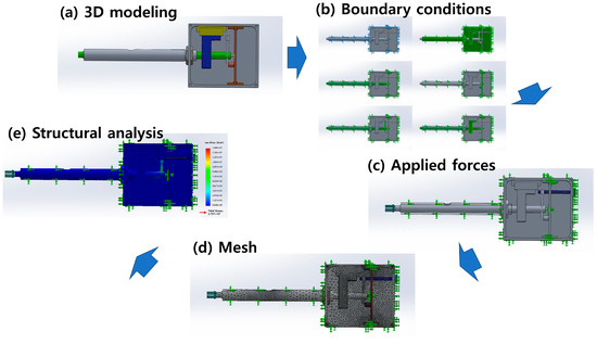 Boundary conditions were determined and are displayed in Figure 5b [24,25]. The enclosure parts (e.g., handle and case) were fixed, while the internal parts (e.g., linear motion (LM) guide, housing, shaft, and sensor PCB) were bonded. The shaft and housing were subjected to friction, where the pressure applied to the swab might be transferred to the force sensor. Pressure on the top of the swab and axial force by initializing the bolt were included as external loads, as shown in Figure 5c. Preloading using the initializing bolt could influence the normal friction force, and, thus, the resistance against the force transferred to the sensor could be varied. These were crucial factors for precise measurements using FGT as an ATMD [26,27]. Finally, structural analysis was conducted to evaluate the stress distribution of each component, as shown in Figure 5e.