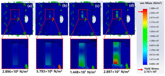Maximum von Mises stresses measured using the sensing unit as a function of axial forces: (a) 0.98 N, (b) 1.96 N, (c) 4.9 N, and (d) 9.8 N.