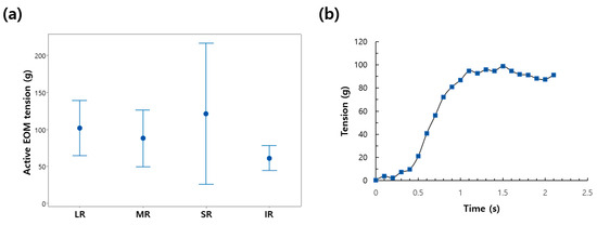 The active EOM tensions for the four rectus muscles were 101.7 ± 15.0 g, 88.0 ± 15.4 g, 61.3 ± 6.8 g, and 121.3 ± 38.5 g for the LR, medial rectus, inferior rectus, and superior rectus, respectively, as shown in Figure 8a. The substantial variation observed in SR values may be attributed to a unique anatomical feature distinguishing it from other muscles. Unlike other muscles, the SR forms a complex with the levator muscle and shares neural innervation. It is impractical to exclude the possibility that the force of the levator muscle has a concurrent influence when measuring the active force of the SR. This could potentially be a significant contributing factor to the observed variation. In future research endeavors, we plan to conduct prospective analyses using large datasets to address this issue. In addition, EOM tensions in Figure 8a were higher than those measured in previous studies of 45 g to 60 g [16,31]. Those previous studies only measured the EOM tension directly in detached EOMs during saccadic eye movements. The EOM was detached from the globe and attached to a strain gauge system using a silk suture. However, in the current study, we did not detach the EOM and measured the active EOM force under a typical clinical condition. Our measurements, therefore, contained passive elastic tensions that arose from ocular connective tissue, which represents the counteracting elasticity of the orbit that attempts to move the eye back to its central position. Our method is non-invasive and similar to the traditional method of conventional FGT using a cotton-tipped swab, making it easy to perform, thus lowering the barrier of application for clinicians.
