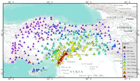 Distribution of seismic recording stations and PGA during the Pazarcik earthquake in Türkiye [16].
