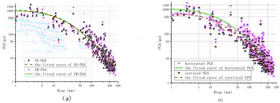 (a) Fitted attenuation curves for EW and NS PGA values; (b) fitted attenuation curves for horizontal and vertical PGA values.