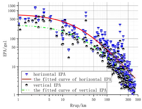 Due to the influence of high-frequency components and various complex factors, PGA is highly unstable, as it is controlled by high-frequency ground motion. The seismic response of a structure does not solely depend on individual PGA values. For example, decreasing the peak values that are above the structural natural frequency does not substantially affect the structural response because the response is influenced by the contributions of all harmonic components within a certain frequency band [20,21]. The use of response spectra for the measurement of the seismic response of structures is an appropriate and broadly accepted method. Considering the typical natural frequency range of general building structures, the frequency range of 2 to 10 Hz is commonly selected. Dividing the average value of the smoothed response spectra with a damping of 5% by 2.5 yields the equivalent value of EPA [2]. In this research, Model 3 was utilized to fit the EPA prediction equation. The coefficients are presented in Table 5, and the EPA attenuation curves shown in Figure 3 suggest that the vertical EPA exhibits a slightly slower decay rate compared to the horizontal EPA.