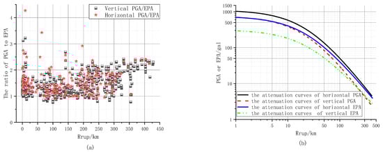 (a) Scatter plot of PGA-to-EPA ratio for each station; (b) comparison of PGA and EPA attenuation curves.