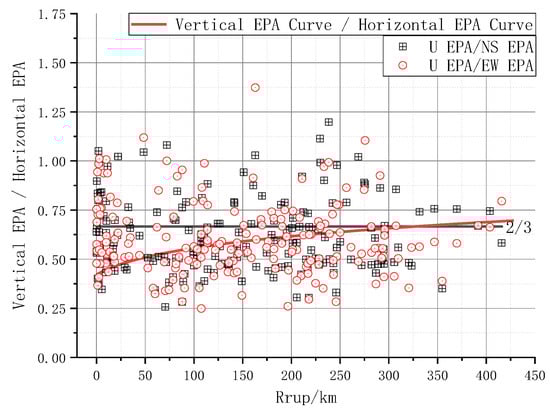 The average ratio of the vertical EPA to NS EPA for all strong-motion records was 0.6075, while the average ratio of the vertical EPA to EW EPA was 0.6029. The NS EPA was roughly 1.0089 times the EW EPA. The computed values of the vertical EPA from the prediction equation were 0.590 times the computed values of the horizontal EPA. Figure 6 suggests that within a fault distance of 0–300 km, the V/H ratio of the computed values from the EPA prediction equation is consistently below 2/3, ranging from 0.42 to 0.69. The V/H values of EPA in the strong-ground-motion records at each station exhibited a substantial dispersion, with a maximum value of 1.37 and a minimum value of 0.25. Records with V/H ratios smaller than 2/3 accounted for over 68% of the total records. It is evident from the comparison of Figure 5 and Figure 6 that the V/H curves for PGA and EPA computed from the prediction equations differ significantly. The V/H curve for EPA gradually increased with an increasing fault distance, while the PGA exhibited a pronounced vertical effect near the fault. Further research is required to scrutinize the influence of near-field vertical effects on structural damage in Turkish earthquakes.
