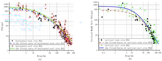 (a) Comparison of horizontal PGA attenuation curves for bedrock and soil sites; (b) comparison of vertical PGA attenuation curves for bedrock and soil sites.