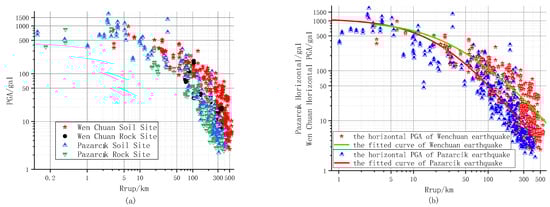 (a) Scatter plot of PGA values for different soil types in the Wenchuan earthquake and the Pazarcık earthquake; (b) comparison of attenuation characteristics between the Wenchuan earthquake and the Pazarcık earthquake.