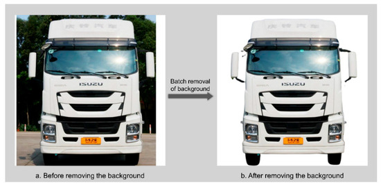 In this study, we tested various methods of batch background removal, and finally chose to use the “API key” of the “removebg” website to realize the batch removal of the background of the truck front face sample image. This method can save a lot of time and human labor, and its removal effect is even better than the non-professional manual removal effect. The effect comparison before and after background removal is shown in Figure 4.