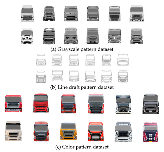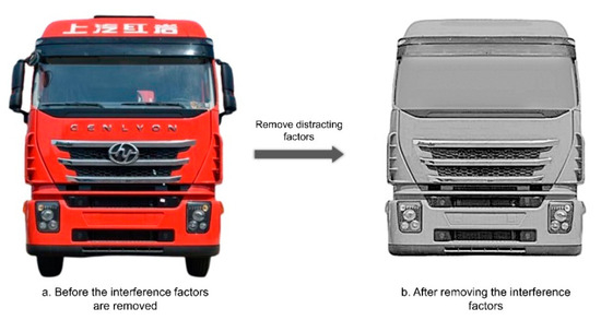 In the removal of interfering factors, all truck front face samples need to be covered or removed without a trace where the brand information can be displayed, such as the license plate, car logo, and text. All truck front face samples need to be decolorized. All truck front face samples need to remove the wheels, chassis, rearview mirrors, and accessories on the roof that do not belong to the factory. All sample pictures should keep the brightness and contrast of the image consistent in actual display. The windshield has large reflections that are not easy to remove, so a uniform glass template is specially made to replace the windshield area of each sample picture. The effect comparison before and after removing the interference factors is shown in Figure 5.