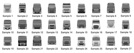 The 597 images of the truck front faces mentioned in the previous section are too large a volume of data for an affective imagery test. To reduce the burden on subjects, a small number of representative samples are identified according to certain rules before conducting the Kansei cognitive measurement experiment. First, a focus group of 7 industrial design graduate students was invited to classify 597 truck front samples using the KJ method based on the appearance similarity among the samples, and the results classified the truck front samples into 27 categories. After that, each focus group member was asked to select 1–2 sample images in each category of sample clusters that best represent that category, and the sample with the highest frequency of selection in each category was counted as the representative sample of that category. The representative samples obtained from the initial clustering are shown in Figure 6.