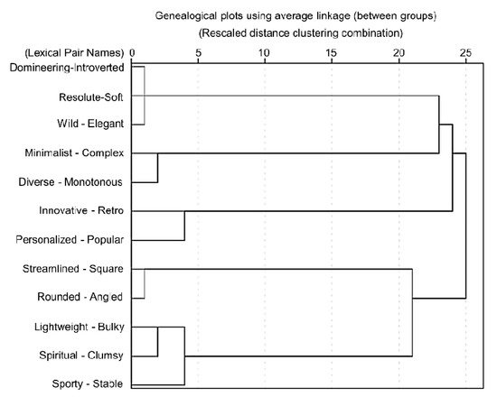 - First, 5 graduate students majoring in design are invited to pre-classify 27 representative samples, and the classifiers are required to classify the representative samples according to the similarity of emotional image style between the samples, without specifying the classification criteria or the number of classifications in advance. The results show that when the number of categories is 12–15, categories with obvious differences can be obtained.