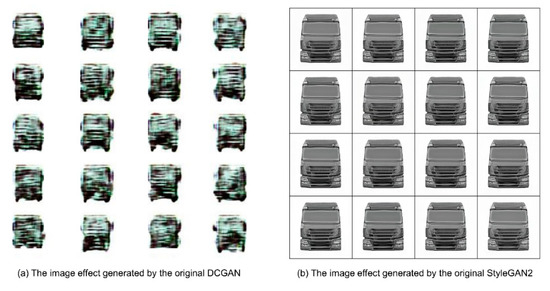 Designing a neural network training model suitable for the research objectives is the foundation for achieving intelligent design of truck front faces. This method takes the emotional image of the truck front face shape as the control variable and uses a generative adversarial network to generate a targeted truck front face shape scheme. This experiment utilized dataset classification to incorporate perceptual images into the image generation process and created 15 generation models. Each model contains two attributes: image mode and perceptual imagery. When it is necessary to generate a new design scheme for the front face of a truck that conforms to a certain emotional image, simply call the corresponding generation model to quickly generate a specified number and form of new scheme images. The specific experimental process of this scheme includes (1) establishing a truck front face dataset based on image patterns and image classification; (2) comparing the generation effect of DCGAN and StyleGAN2 through pre-experiments; (3) designing a generative adversarial network model that meets the task requirements to address the shortcomings of the original StyleGAN2 in the pre-experiment; (4) debugging and generating parameters and the network structure of adversarial networks, visualizing the training process, and training them into models; and (5) using the generated model to output images and verify the generation effect.