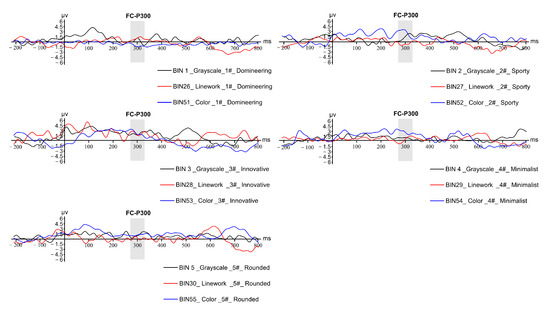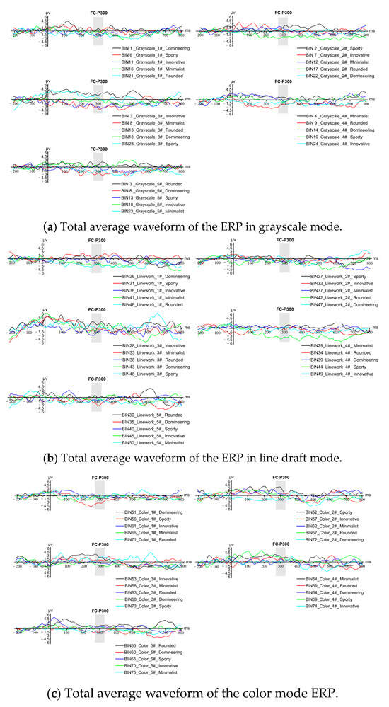 This study obtained the EEG waveform of participants when they saw image vocabulary through EEG experiments. Afterward, the ERP signals related to cognition were analyzed and extracted to summarize the objective matching degree between the newly generated truck front face styling scheme and its corresponding image vocabulary in the minds of the participants. Verify whether the matching degree between the new scheme image generated by the network and its corresponding image vocabulary is the highest among the 5 image semantic words. Simultaneously measure which image mode, grayscale image, line draft image, and color image has the best cognitive effect under the same image vocabulary. The ERP component studied in this experiment is mainly P300, which is a positive wave generated around 300 ms after the appearance of visual stimuli. The formal experiment adopts three image processing modes: “grayscale image”, “line draft image”, and “color image” × 5 (each image processing mode has five network-generated images corresponding to five image semantic words) × A mixed experimental design method of five (five image semantic words: “domineering”, “dynamic”, “innovative”, “minimalist”, and “rounded”), which will be conducted for a total of seventy-five trials. Among them, the standard process for a trial is as follows. First, a fixation point “+” will appear in the center of the screen, with a duration of 1000 ms; next, a pre-trained network-generated truck front face new scheme will appear as the “starting material”, with a duration of 3000 ms; after that, a blank screen of 1000 ms will appear; then, present an image semantic word as the “target material” for a duration of 1000 ms; and finally, a blank screen of 1000 ms will be presented. Finally, the EEG signals stimulated by the same stimulus were superimposed and averaged among all participants to obtain the total average waveform. Then, observe the peak response of the total average waveform under different stimuli at around 300 ms and select the area of 270–330 ms as the observation interval in this experiment.