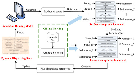 Unlike the above, data-based methods pay more attention to the knowledge hidden in manufacturing systems. Applying data-driving methods to solve scheduling problems is a burgeoning study direction [11]. By analyzing production data, researchers can excavate hidden information about relevant problems and then turn it into available knowledge through modeling. If available knowledge is used to identify and solve problems, they rely on data mining rather than human experience. In this way, manufacturing knowledge can be utilized more effectively [12]. Although some significant successes in dynamic scheduling, goal-driving, and closed-loop mechanisms have been achieved, they are often considered separate decisions in scheduling problems. Thus, scheduling methods are unable to adapt well to real-time changes in production environments. Therefore, this paper proposes a PSO-SVM-based scheduling method with a performance-driving and feedback mechanism.