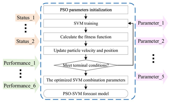 This research used a PSO-SVM to build the performance prediction model and the parameter optimization model. The workflow is illustrated in Figure 4 and Figure 5, respectively.