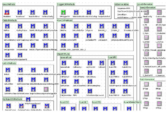 To evaluate the efficiency of the CDR and the PSO-SVM-based scheduling method, we embedded the CDR into the simulation model, which was built according to an industrial semiconductor manufacturing system (a mixed 5″ and 6″ semiconductor manufacturing system of a semiconductor manufacturer in Shanghai) and conducted a series of simulation experiments. The simulation platform was built in the Tecnomatix Plant Simulation software 2022, which belongs to Siemens. The control layer and the function layer of the simulation platform are shown in Figure 6. In terms of experimental hardware, three Nvidia GeForce RTX 4000 GPUs (Nvidia, Santa Clara, CA, USA) were used to train and validate corresponding models.