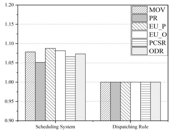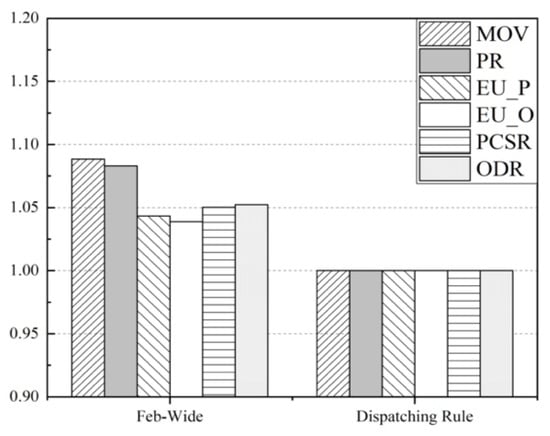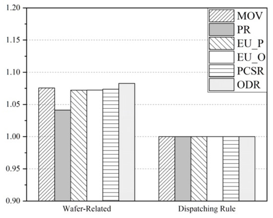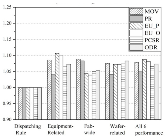 To clarify the distinction among different performance-driving, we recorded the simulation results of CDR, scheduling methods with fab-wide performance-driving, equipment-related performance-driving, wafer-related performance-driving, and with all six selected performance-driving. Simulation results and normalization results are shown in Table 8 and Figure 13, respectively.