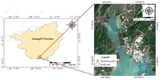 Qinzhou Bay is located on the southern coast of Guangxi, China. It consists of three parts: the inner bay, the neck of the bay, and the outer bay, forming a typical gourd-shaped bay (Figure 1). The bay’s formation could be attributed to the rise in sea level during the late Quaternary ice age and the submergence of ancient river valleys by seawater [25,26]. The Bay has a subtropical monsoon climate characterized by high annual rainfall, with an average annual temperature of about 23 °C. Factors such as runoff from the Qin and Maoling rivers, as well as the region’s topography, limit water exchange capacity. These conditions facilitate the accumulation of nutrients, resulting in the frequent occurrence of red tide phenomena in Qinzhou Bay.