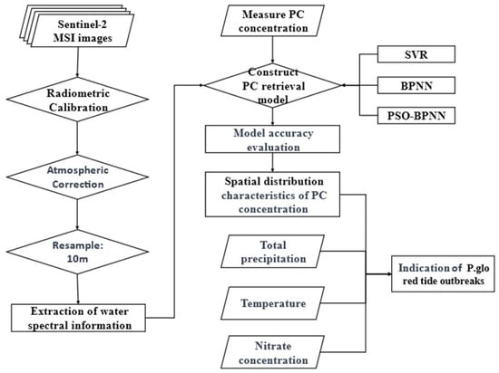 To evaluate the performance of the PSO-BPNN model, we compared it with the traditional backpropagation neural network (BPNN) and the support vector machine regression model (SVR). After confirming the high retrieval accuracy of the PSO-BPNN model, we applied it to analyze the changes in PC concentration using Sentinel-2 MSI images taken before and after the 2017 red tide outbreak of P. glo in Qinzhou Bay. For a comprehensive understanding, the analysis incorporated additional environmental variables such as sea surface temperature, precipitation, and inorganic salt concentration. Finally, the indicators for the P. glo red tide outbreak in Qinzhou Bay were established. The technical route of the study is shown in Figure 2.
