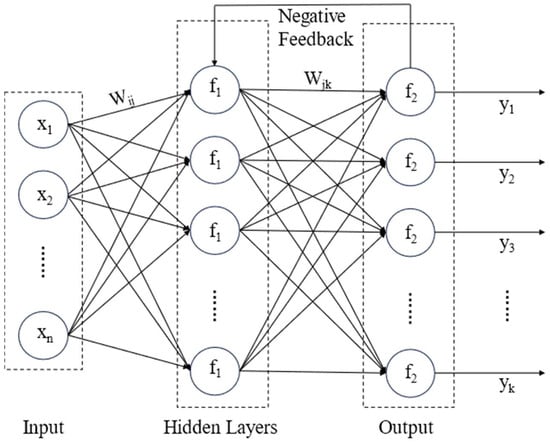 where Ij and Ik represent the input values of the hidden layer and output layer, respectively; yj and yt stand for the output values of the hidden layer and output layer, respectively; ω correspond to the weights; β is the thresholds; f is the activation functions, with each neuron in the same layer sharing the same activation function; n and h refer to the number of nodes in the input layer and hidden layer, respectively.