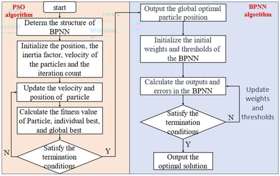 To address the issue of BPNN being susceptible to local minima, many scholars have developed intelligent optimization algorithms such as the Genetic Algorithm (GA) [32], Ant Colony Optimization Algorithm (ACO) [33], and the Particle Swarm Optimization Algorithm (PSO) [34]. These optimization algorithms aim to transition the initial weights and thresholds of BPNN from a random state to a well-established state. Compared with other intelligent optimization algorithms, the position of each particle in PSO is updated based on the historical experience of both individual particles and entire group, and the introduction of the inertia weight ω of the speed as in Equation (6). The speed of movement of the particle decreases with an increasing number of iterations. This ensures that particles explore a broader range of possibilities during the early optimization stages while accurately converging to the optimal position in the later stages. At this point, the particle’s position represents the optimally initialized weights and thresholds for BPNN [35,36]. This process can be expressed by Equations (7) and (8).