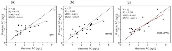 (1) Compared with the performance of different models, the BPNN model optimized through PSO significantly enhanced the accuracy of PC concentration retrieval. In the validation set, the mean absolute error (MAE) and the root mean square error (RMSE) were 0.469 and 0.615, respectively, demonstrating that its retrieval accuracy meets the requirements for the remote sensing of low PC concentrations.