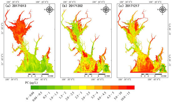 Retrieval map of PC concentration in Qinzhou Bay. (a) The image PC retrieval concentration distribution map obtained on 13 October 2017; (b) the image PC retrieval concentration distribution map obtained on 2 December 2017; (c) the image PC retrieval concentration distribution map obtained on 17 December 2017.