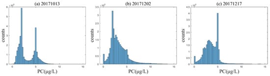 Histogram of PC concentrations. (a–c) are images from 13 October 2017, 2 December 2017, and 17 December 2017, respectively.
