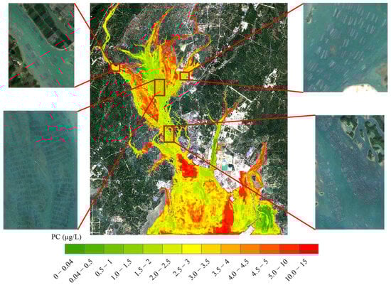 According to Figure 6 and Figure 7, it is evident that the maximum PC concentration in Qinzhou Bay was 14.81 μg/L. PC concentrations below 1 μg/L were more prevalent in the outer bay, especially near coastal ports. The majority of the water areas maintained PC concentrations between 2 and 5 μg/L. Generally, the PC concentration was higher in the inner bay, gradually decreasing from the inner bay towards the outer bay. However, the PC concentration is influenced by external environmental factors, such as rainfall, oyster culture, hydrodynamic changes, and the outbreak of P. glo red tides, amongst others. As shown in Figure 8, on 2 December 2017, there was a generally low PC concentration around the oyster raft culture area. This phenomenon may be attributed to oysters competing for nutrient resources with cyanobacteria during the growth process and even feeding on cyanobacteria [41,42], thereby limiting the survival space of cyanobacteria. During the outbreak of P. glo red tide, it can be clearly seen that the undetected area of PC concentration significantly expanded by 4.97 km2, particularly concentrated around the Sandun Harbor Pier in the southeast area of Qinzhou Bay (coinciding with the location of the outbreak of P. glo). This indicates that the P. glo outbreak can suppress the growth of blue-green algae. Due to the obstructive nature of the reclaimed land in the enclosed sea area, tidal currents are notably weaker. Local tidal currents change direction due to the alteration of the flow direction intersecting with the tidal current in the fairway. The area of the P. glo outbreak resembles a rotating eddy current, suggesting that the formation of this eddy current morphology is likely related to the hydrodynamic environment of Qinzhou Bay.