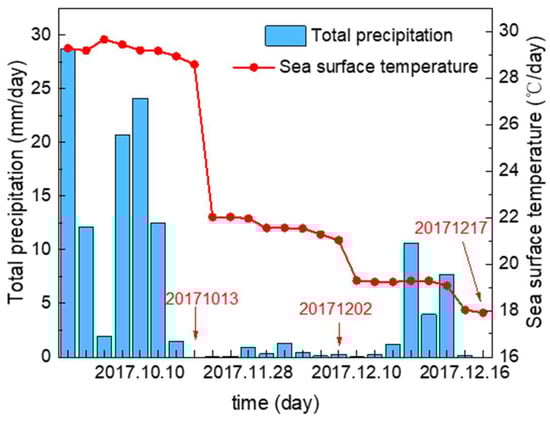 The study collected meteorological data, including total rainfall and sea surface temperature, from ERA5 (https://cds.climate.copernicus.eu/cdsapp#!/dataset/reanalysis-era5-single-levels?tab=form (accessed on 19 July 2023)) hourly reanalysis data with a resolution of 0.25° × 0.25°. Furthermore, the inorganic salt data were collected on-site along with the PC concentration as part of the automatic monitoring data. It was measured using an in situ nutrient analyzer, which employs the method of diethylene triamine pentaacetic acid (DTPA) reduction colorimetry.