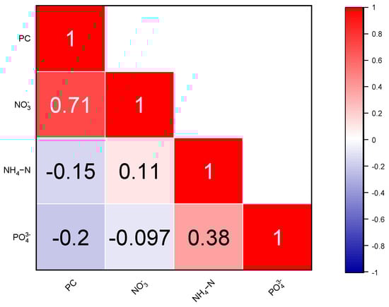 Relevant studies have shown that during P. glo outbreaks, a substantial consumption of nitrates occurs to form cysts [43]. P. glo outbreaks not only compete for the living space of cyanobacteria, but also in the presence of a large number of cysts, float on the surface of the seawater, blocking the sunlight required by cyanobacteria for photosynthesis and leading to a decline in their abundance. This observation aligns with Figure 10, where the best correlation between PC and nitrate is the strongest, reaching 0.71. Compared with 2 December, on 17 December, the continuous rainfall had an impact. It caused inland waters with low inorganic phosphorus and high inorganic nitrogen from the Qin River and Maoling River to flow into Qinzhou Bay [44]. This influx resulted in an overall increase in PC concentration throughout Qinzhou Bay. Near Sandun Harbor (Figure 11), the semi-exchange period of water significantly decreases due to the effects of land reclamation before the rainfall. PC concentrations stay below 1 μg/L, consistent with the findings of Lv et al.’s dye diffusion study [45]. After the rainfall, influenced by surface runoff, the water’s exchange capacity increases, allowing for the replenishment of nutrients in the water. As a result, PC concentrations near the runoff areas significantly increase.