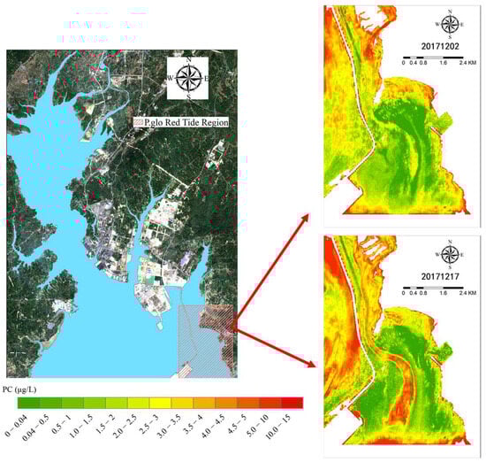 Based on the 2017 Qinzhou Municipal State of the Marine Environment Bulletin, the PSO-BPNN inversion model was employed to track the PC concentration during the P. glo red tide event in Qinzhou Bay from November to December 2017. The distribution of PC concentrations is shown in Figure 6 and Figure 7.