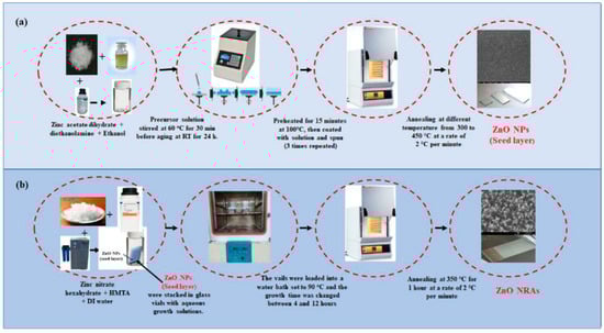 Schematic diagram of the fabrication of a ZnO quasi-one-dimensional structure in two steps: (a) Sol–gel spin coating and (b) hydrothermal method [].