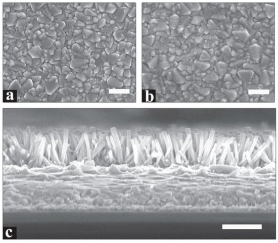 Scanning electron microscope (SEM) image from a top view showing (a) a fluorine-doped tin oxide-coated substrate and (b) a seed layer. (c) Cross-sectional SEM image illustrating the ZnO nanowires that have been grown. All scale bars in the images represent a length of 0.5 μm [].
