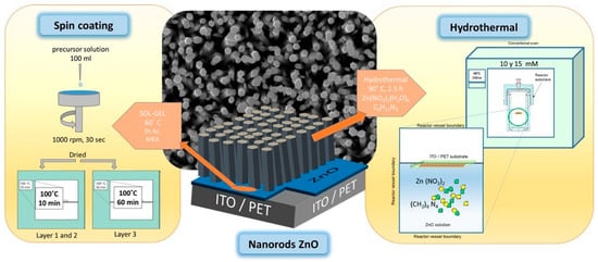 Two-step process of the fabrication of ZnO nanorods, which contains the sol–gel process and subsequent hydrothermal synthesis [].