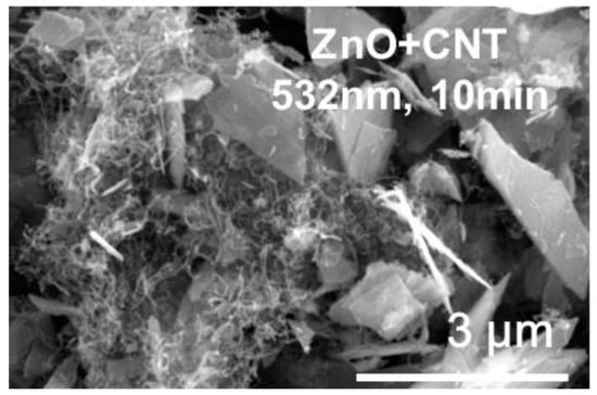 SEM image of the hybrid material containing ZnO nanosheets and one-dimensional carbon nanotubes (CNT) obtained by pulsed laser ablation over a period of 10 min, at a laser wavelength of 532 nm [].
