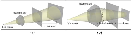 In [], a freeform optics design method for illumination and laser beam shaping has been presented, the aim of which is to optimize one or more free-form surfaces to transform the original irradiance distribution into the desired one. The optimization process solves the tailoring optics problem, which is an inverse problem. One of the advantages of this method is that the geometric conditions, the number of free-form surfaces, and the illumination conditions can be easily changed in the process of its solution. As shown in Figure 7, using the known values of the input f(x1, y1) and output g(x2, y2) irradiance distributions, the ray mapping function from plane to plane was estimated. Once the values of (x2, y2) were obtained and related to (x1, y1), free-form surface optimization was carried out [].