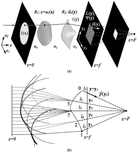 In [], the task of forming a predefined illuminance distribution and wavefront is formulated as follows. It is assumed that the following parameters are specified: The illuminance distribution I(x), x ∈ G, formed in the plane z = 0 by an incident beam with a plane wavefront, the desired illuminance distribution L(y), y ∈ D, formed in the output plane z = f, and the desired eikonal Ψ(y) distribution in the same plane (Figure 9). It is necessary to find such functions as u1(x) and l(y) at which the light beam that passes through the optical element will form in the output plane z = f a predefined illuminance distribution L(y) and a predefined eikonal Ψ(y). Simultaneous control of the illuminance distribution and wavefront requires the use of an optical element with two “working” surfaces—refractive or reflective [].