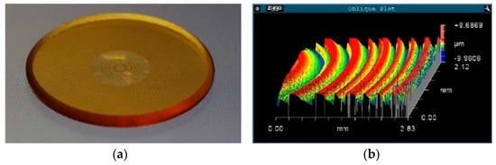 (a) Photo of the spectral diffraction lens. (b) Fragment of the diffraction lens microrelief measured with a Zygo New View 7300 white light interferometer [].