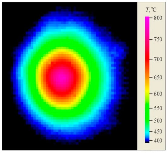 In experimental studies, a CO2 laser with radiofrequency excitation was used. Beam shaping was accomplished using an optical system that featured a diffractive optical element, as described in []. The pulse frequency was varied within a wide range, from 3 to 5000 Hz. In order to produce a ZnO/Cu nanocomposite with metal-semiconductor properties, pulse-periodic laser processing of the metallic material in ambient air was conducted. Laser irradiation induced a rise in temperature, primarily concentrated in the central area rather than at the periphery. The registered temperature field in the sample can be visualized in Figure 11 and the temperature distribution graph along the sample’s central region in the heat-affected zone can be seen in Figure 12 [].