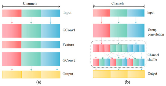 Research on image classification methods based on lightweight deep neural networks has made considerable progress in recent years. Among them, the ShuffleNet series algorithms proposed by Megvii Technology have been widely applied in object detection for edge computing due to their ability to achieve the best model accuracy with limited computational resources. The ShuffleNet network employs two core operations [22]: group convolution and channel shuffle. These operations substantially decrease the model’s computational intricacy while preserving accuracy. However, group convolution is limited in that each group operates independently without feature fusion between groups. As shown in Figure 4a, when the convolution kernel is divided into three groups, the resulting feature maps are also divided into three groups, with each group only exchanging information internally, lacking any information fusion between groups. Therefore, ShuffleNetv1 proposed the concept of channel shuffle, which divides the channels in the feature map into several groups according to certain rules and then rearranges the elements within each group. Doing so enhances the information interaction and fusion between channels, increasing the model’s non-linear expression capability without compromising network accuracy. The channel shuffle operation is illustrated in Figure 4b.