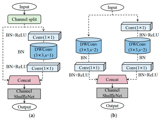 ShuffleNetV2 unit structure. (a) Basic unit structure diagram; (b) downsampling unit structure diagram.