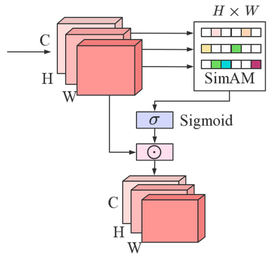 Its computational formulas are shown in Equations (6)–(8). SimAM evaluates the importance of each neuron in the network by defining an energy function based on linear separability. Here, t denotes the target neuron, xi represents neighboring neurons, and λ is a hyperparameter. and represent the average and variance of all neurons within the channel, excluding t. The lower the energy, the higher the differentiation between neurons and adjacent neurons, and the higher the importance of neurons.