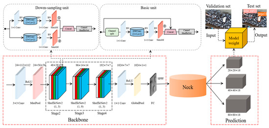 Considering the speed requirement for non-coal foreign object detection by the mining inspection robot, ShuffleNetv2 0.5X is chosen as the backbone network, and improvements are made to this model. The enhanced network architecture is depicted in Figure 7. The network architecture includes Conv (standard convolution), MaxPool (max pooling), ShuffleNetV2(1,3) (downsampling module stacked one time, basic unit module stacked three times), GlobalPool (global pooling), FC (fully connected layer), ReLU (activation function), BN (batch normalization), DWConv (depthwise separable convolution), SimAM (simple and parameter-Free attention mechanism), Concat (channel concatenation), Channel shuffle (channel shuffle module), and Channel split (channel splitting module). The specific operations are as follows: