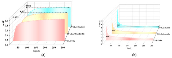 Based on Figure 8a,b, and in combination with Table 2, it can be obtained that the YOLOv8n-shuffle model and YOLOv8n-SM model show better convergence performance compared to the baseline YOLOv8n network model. They both reach a stable state after approximately 60 iterations. The YOLOv8n-SM model achieves a precision of 95.3% (an improvement of 1.5%), a recall of 90.0% (an improvement of 2.2%), and the highest recognition accuracy of 93.8% (an improvement of 1.5%).