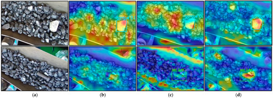 In the figure, the first row represents images of coal gangue, and the second row shows images of nuts. Figure 9 illustrates that the YOLOv8n model places greater emphasis on other object features, such as conveyor belts and rollers, which results in an increased inference speed and overall computational complexity during feature extraction. However, when using the lightweight ShuffleNetv2 network as the backbone, the model starts to pay attention to the feature regions where materials are conveyed on the conveyor belt. With the integration of the SimAM into the ShuffleNetv2 model, the attention is concentrated on the relevant feature regions of non-coal foreign objects, enhancing its ability to discern key features of the foreign objects. Additionally, Figure 9 demonstrates that the model with the introduced SimAM module can more accurately extract the feature information of non-coal foreign objects while effectively avoiding interference from non-essential features, such as background environments.