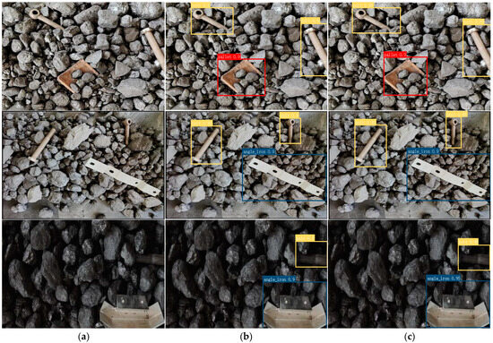 Alongside the mAP and model parameter count, the neural network model’s capacity for generalization serves as one of the metrics for assessing model quality. We expect that the model, trained on the dataset, will deliver a sensible output when presented with new samples not included in the dataset. Because of the particularity of the application context, there is currently no openly accessible dataset for detecting foreign objects on belt conveyor systems. Manually introducing foreign objects into coal mine belt conveyor systems would contravene safety regulations. Considering safety concerns, a validation was conducted at Boshitong Limited in Taiyuan, Shanxi Province, China (dataset containing 500 foreign object images, referred to as DataI). The assessment outcomes are displayed in Table 6, while certain detection findings are depicted in Figure 11.