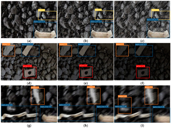 To further assess the model’s capacity for generalization, we applied various image techniques to adjust some images in the DataI dataset, simulating real underground mining conditions such as fog, dust, low lighting, and blurriness due to robot motion during the inspection process. The detection outcomes are depicted in Figure 12 (the leftmost column signifies mild processing, the central column signifies moderate processing, and the rightmost column signifies severe processing).